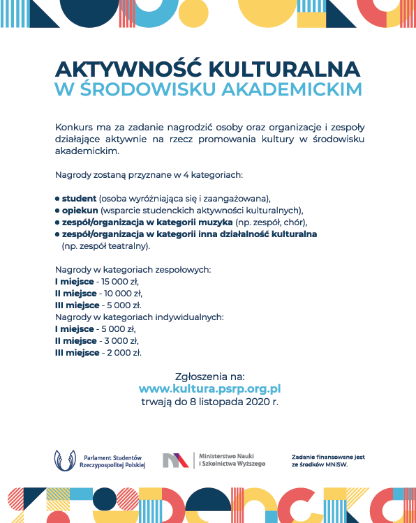 27 paź 2020 Aktywność kulturalna w środowisku akademickim Konkurs ma za zadanie nagrodzić osoby oraz organizacje i zespoły działające aktywnie na rzecz promowania kultury w środowisku akademickim. Więcej...