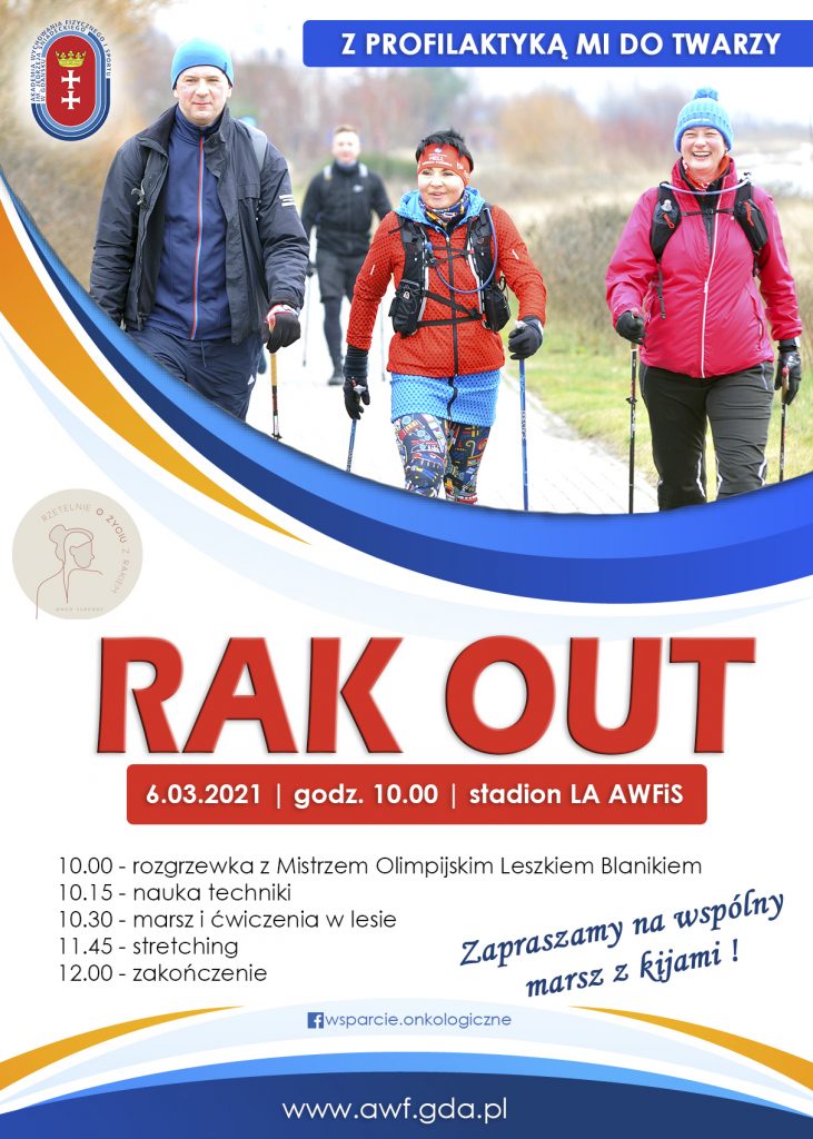 6 marca 2021 o godzinie 10:00 na stadionie Akademii Wychowania Fizycznego i Sportu w Gdańsku odbędzie się pierwsze wydarzenie sportowe – trening Nordic Walking, rozpoczynające cykl spotkań Rak OUT, dedykowane pacjentom leczonym onkologicznie.Spotkania będą miały na celu popularyzację aktywności fizycznej, aktywizację pacjentów z chorobami nowotworowymi, a także edukację onkologiczną. Trening Nordic Walking zostanie przeprowadzony przez wykwalifikowanego instruktora, który po rozgrzewce i instruktażu zabierze grupę do sąsiadującego z AWFiS Trójmiejskiego Parku Krajobrazowego.