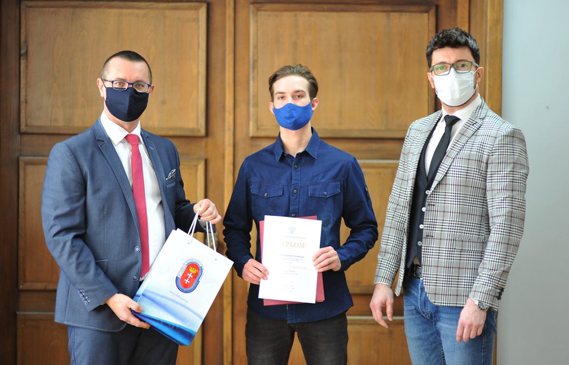 Dnia 18 marca 2021 Rektor AWFiS prof. Paweł Cięszczyk i Prorektor ds. Studenckich prof. Marcin Dornowski wręczyli Sewerynowi Wysokińskiemu, studentowi Akademii Wychowania Fizycznego i Sportu w Gdańsku STYPENDIUM MINISTRA za znaczące osiągnięcia na rok akademicki 2020/2021.