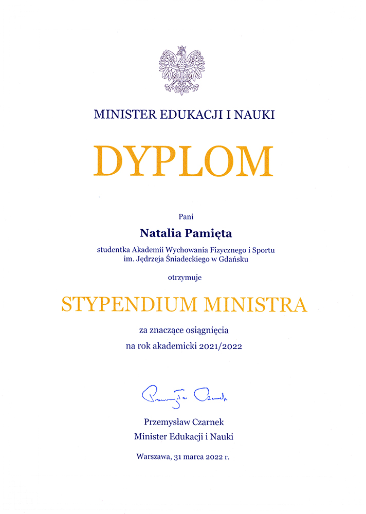 Nasza studentka Natalia Pamięta dnia 9 maja br. z rąk prorektora prof. Marcina Dornowskiego odebrała stypendium Ministra Edukacji i Nauki za znaczące osiągnięcia na rok akademicki 2021/2022.