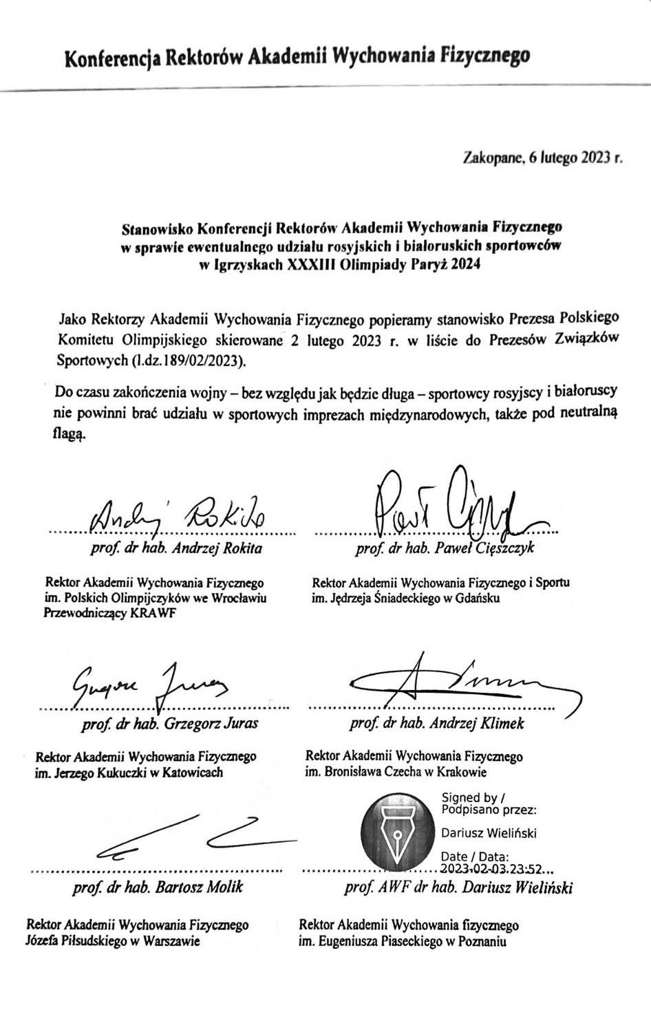 Dnia 6 lutego 2023 r. w Zakopanem odbyło się posiedzenie Konferencji Rektorów Akademii Wychowania Fizycznego, podczas którego Rektorzy poparli stanowisko Prezesa Polskiego Komitetu Olimpijskiego w sprawie ewentualnego udziału rosyjskich i białoruskich sportowców w Igrzyskach XXXIII Olimpiady Paryż 2024 r.