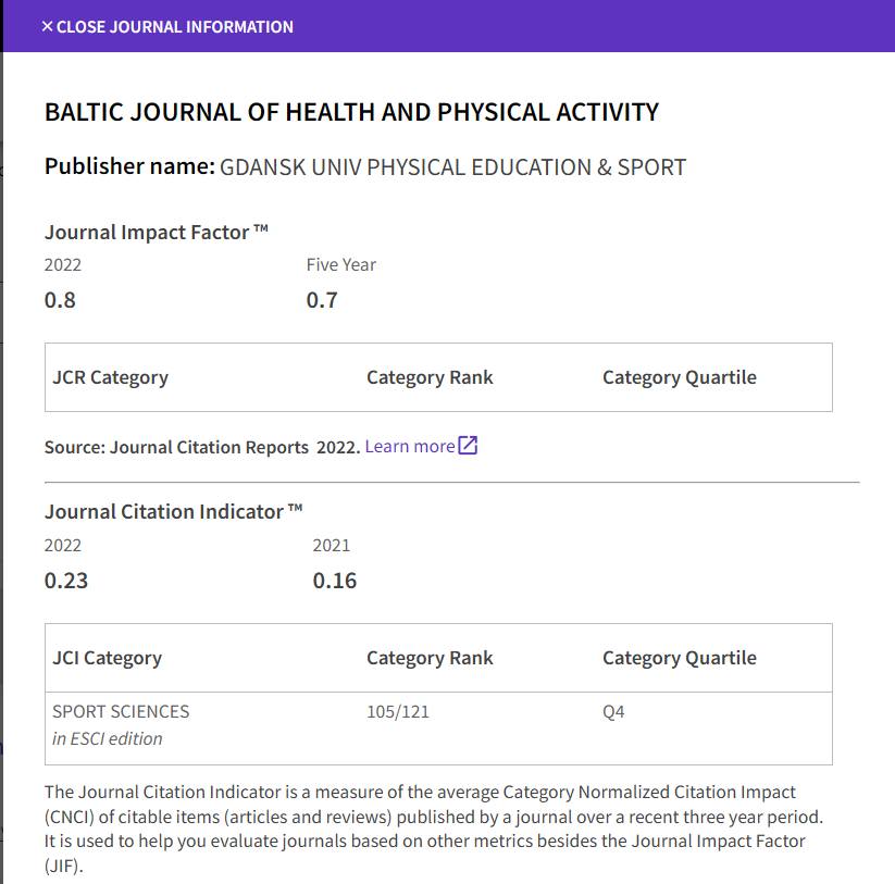 Z dumą i radością informujemy, że wydawane przez naszą uczelnię czasopismo Baltic Journal of Health and Physical Activity, jako indeksowane w Web of Science Core Collection, za 2022 rok uzyskało Journal Impact Factor = 0,8.