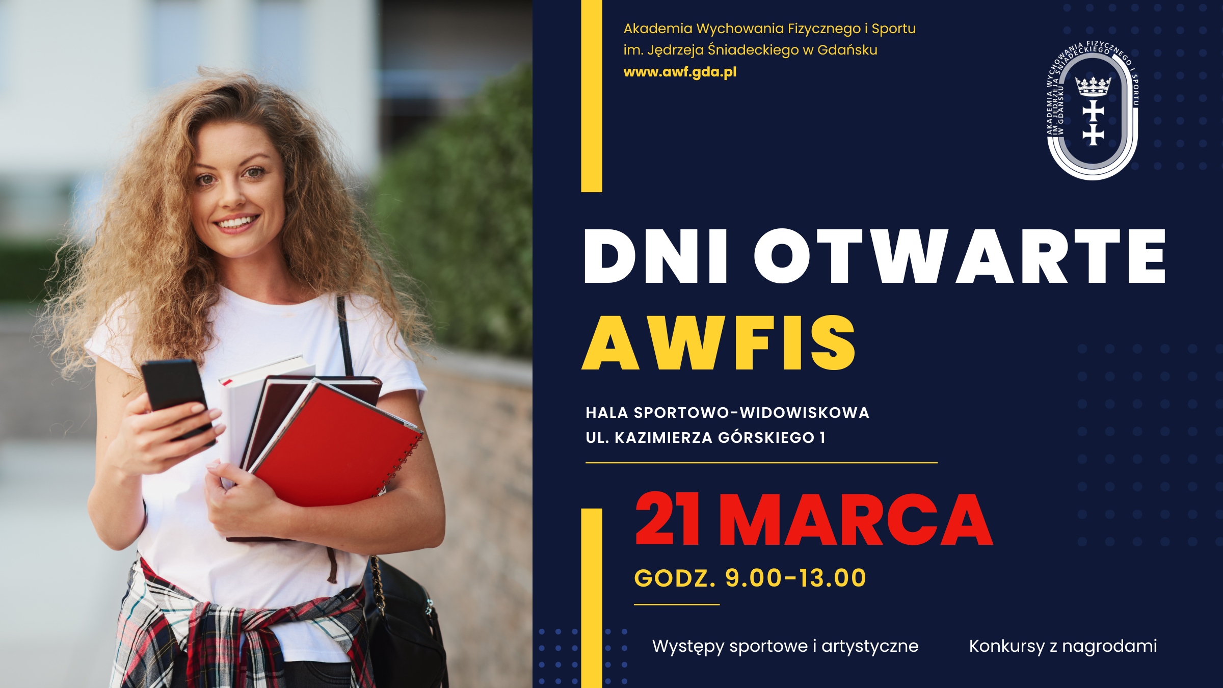 W czwartek, 21 marca bieżącego roku, w godzinach 9.00-13.00, serdecznie zapraszamy do udziału w Dniu Otwartym Akademii Wychowania Fizycznego i Sportu im. Jędrzeja Śniadeckiego w Gdańsku, który odbędzie się w Hali Widowiskowo-Sportowej przy ul. Kazimierza Górskiego 1.