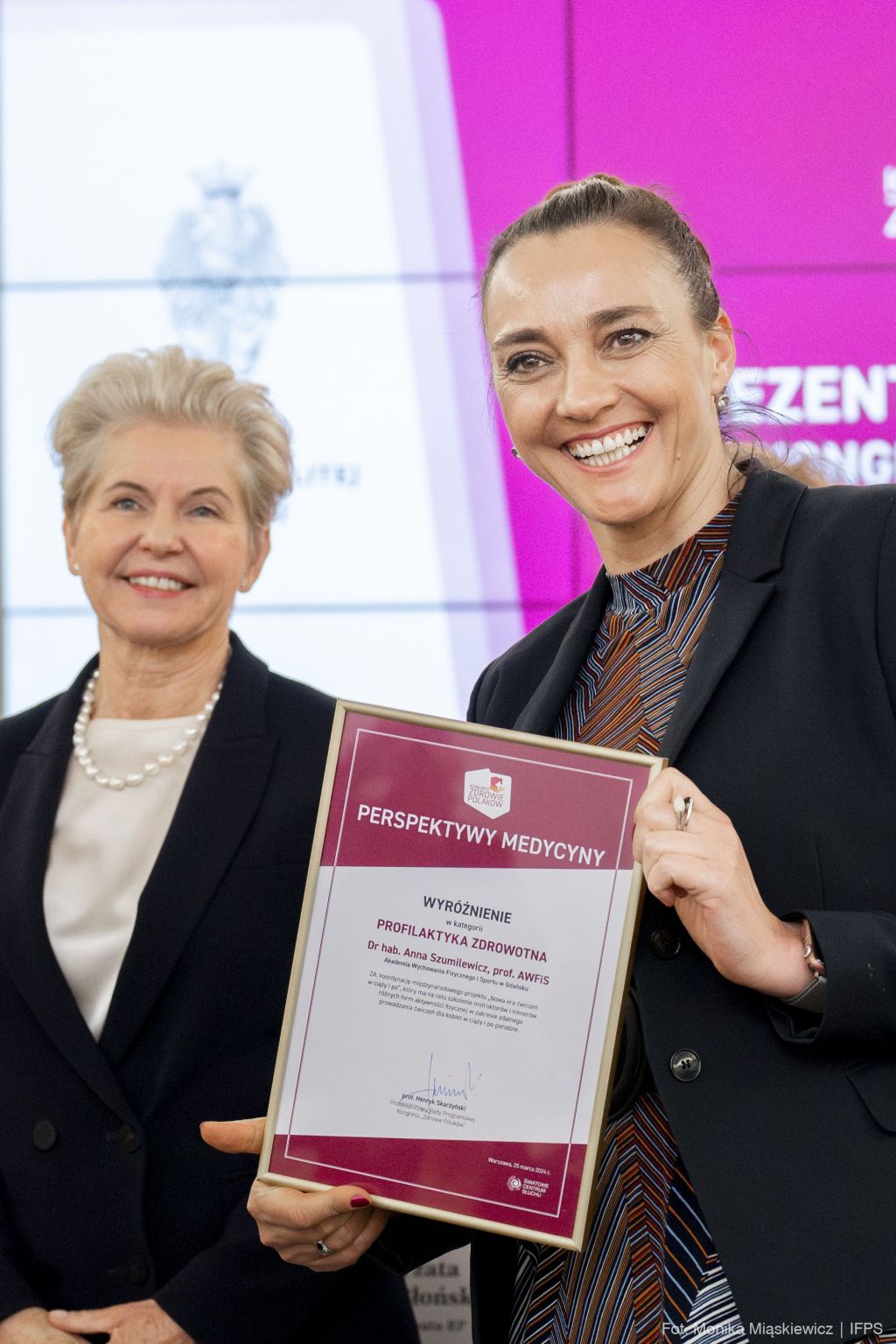 Dr hab. Anna Szumilewicz, prof. AWFiS została wyróżniona w konkursie „Perspektywy Medycyny” 2023 w kategorii „Profilaktyka zdrowotna”, organizowanym przez Radę Programową Kongresu „Zdrowie Polaków”. Uroczysta gala odbyła się 25 kwietnia w gmachu Senatu Rzeczypospolitej Polskiej w Warszawie. Nagrody i wyróżnienia wręczali p. Senator RP, dr n. med. Beata Małecka-Libera (przewodnicząca senackiej Komisji Zdrowia), prof. Henryk Skarżyński (przewodniczący Rady Programowej Kongresu) oraz prof. Piotr Wachowiak (rektor SGH).