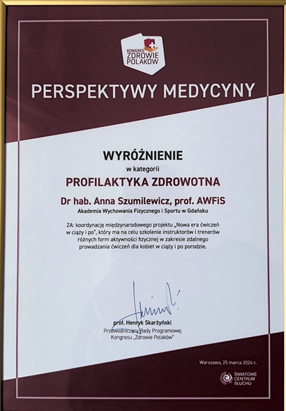 Podstawą wyróżnienia był międzynarodowy projekt NEPPE: „Nowa era ćwiczeń w ciąży i po”, realizowany w Akademii Wychowania Fizycznego i Sportu w Gdańsku (2021-2023), współfinansowany z programu SPINAKER Narodowej Agencji Wymiany Akademickiej. Celem konkursu „Perspektywy Medycyny” jest promowanie ekspertów i liderów, którzy przyczyniają się do podnoszenia poziomu polskiej medycyny, wspierania pozytywnych zmian w ochronie zdrowia w Polsce poprawiających jakość opieki medycznej oraz popularyzacji nauk medycznych. Więcej informacji: 3. edycja konkursu „Perspektywy Medycyny” – Kongres Zdrowie Polaków (kongres-zdrowiepolakow.pl)