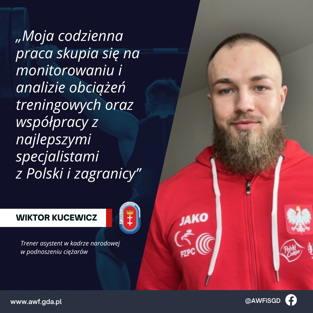 Wiktor Kucewicz, student trzeciego roku na kierunku Sport ze specjalizacją w przygotowaniu motorycznym w sportach walki oraz przygotowaniu motorycznym na Akademii Wychowania Fizycznego i Sportu (AWFiS) w Gdańsku, od początku 2024 roku pełni funkcję trenera asystenta w kadrze narodowej w podnoszeniu ciężarów. To dla niego ogromne wyróżnienie móc współpracować z najlepszymi ciężarowcami z Polski, którzy są medalistami mistrzostw Europy, uczestnikami i medalistami Igrzysk Olimpijskich oraz multimedalistami Mistrzostw Polski.