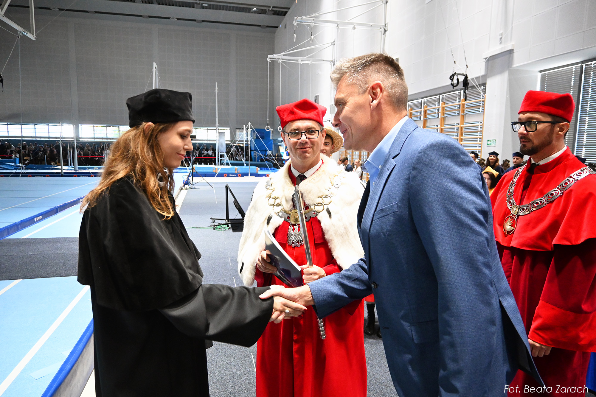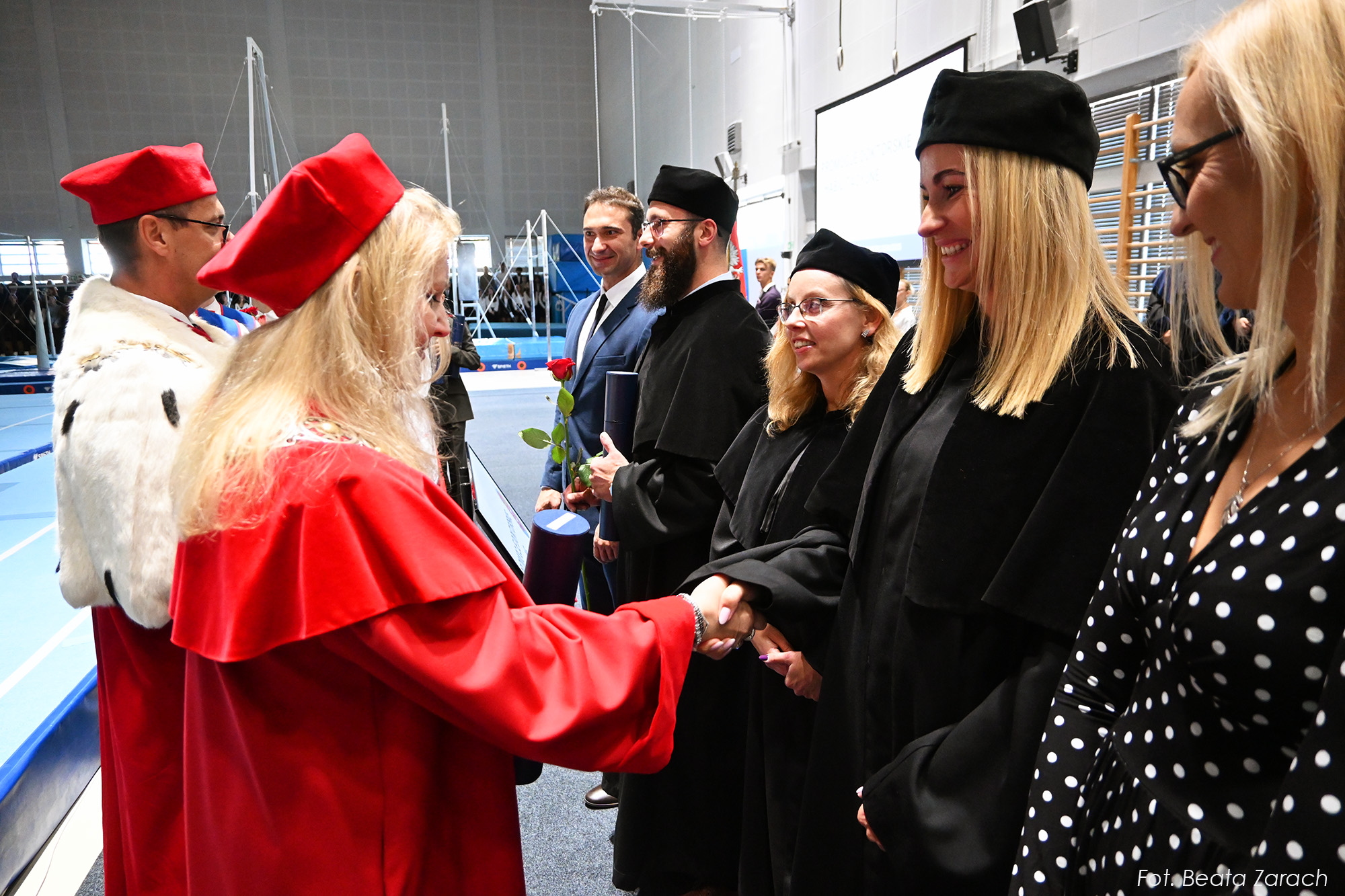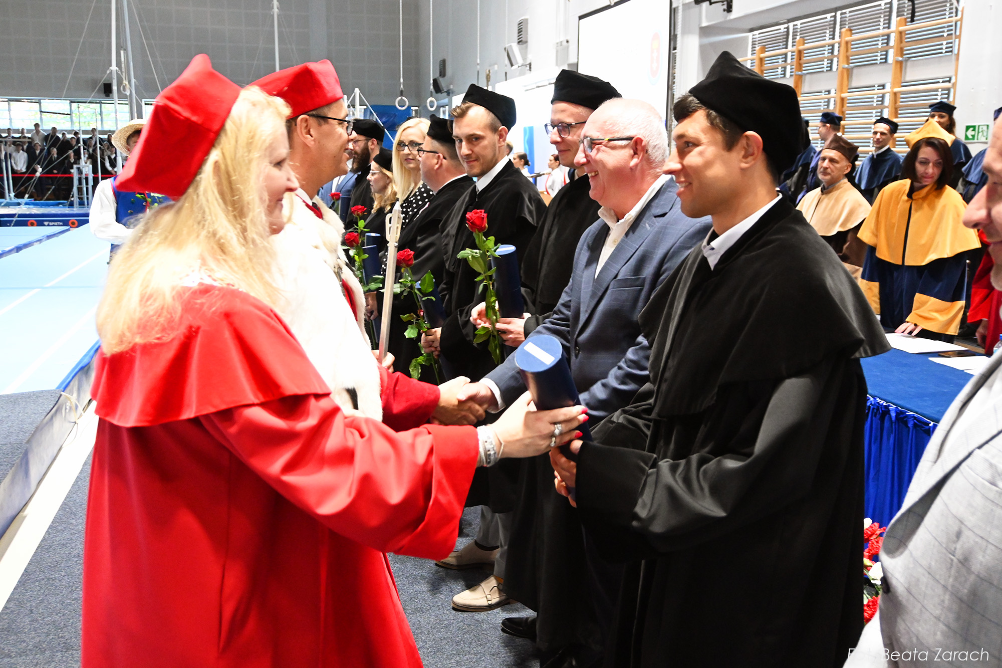 Kolejnym punktem programu była immatrykulacja studentów pierwszego roku, dokonana przez Prorektora ds. kształcenia, dr hab. Marcina Dornowskiego prof. AWFiS, a także ślubowanie i wręczenie dyplomów nowym doktorom, które otrzymali: dr Agata Grzybkowska, dr Dawid Perenc, dr Katarzyna Świtała, dr Bartosz Gondek, dr Maciej Chroboczek, dr Krzysztof Fostiak, dr Zbigniew Jost, dr Kinga Łosińska oraz doktorom habilitowanym: dr hab. Dominika Wilczyńska, dr hab. Sylwester Kujach, dr hab. Marcin Pasek. Ponadto listy gratulacyjne za wyróżnione prace doktorskie otrzymali dr Agata Grzybkowska oraz dr Kinga Łosińska.