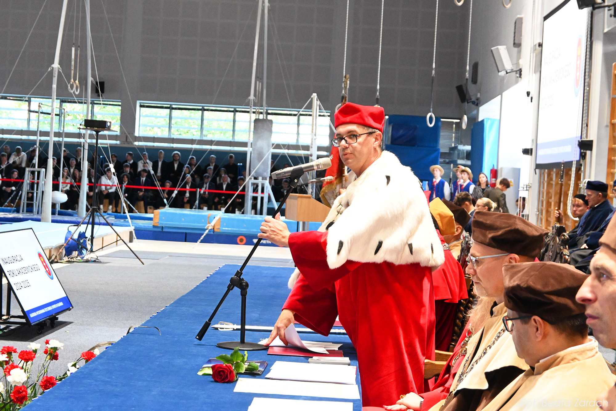 Pierwszym punktem programu było przemówienie Jego Magnificencji Rektora AWFiS prof. dr. hab. Pawła Cięszczyka, który przypomniał o najważniejszych osiągnięciach, omówił zakończone oraz planowane remonty i inwestycje, a także zwrócił uwagę na trudności, z którymi mierzą się obecnie polskie uczelnie.