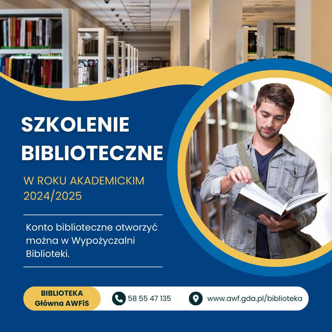 Biblioteka Główna AWFiS w Gdańsku serdecznie zaprasza studentów pierwszego roku na obowiązkowe szkolenie biblioteczne. Szkolenie obejmuje prezentację systemu bibliotecznego oraz zasad korzystania ze zbiorów.