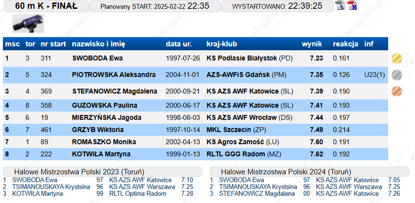 Aleksandra Piotrowska, studentka II roku kierunku Diagnostyka Sportowa w Akademii Wychowania Fizycznego i Sportu w Gdańsku oraz reprezentantka klubu AZS AWFiS Gdańsk, odniosła duży sukces na 69. PZLA Halowych Mistrzostwach Polski Seniorów i U23 w Toruniu. Aleksandra zdobyła srebrny medal w biegu na 60 metrów w kategorii seniorek, osiągając wynik 7,35 s. Był to jej pierwszy indywidualny medal w seniorskiej rywalizacji.