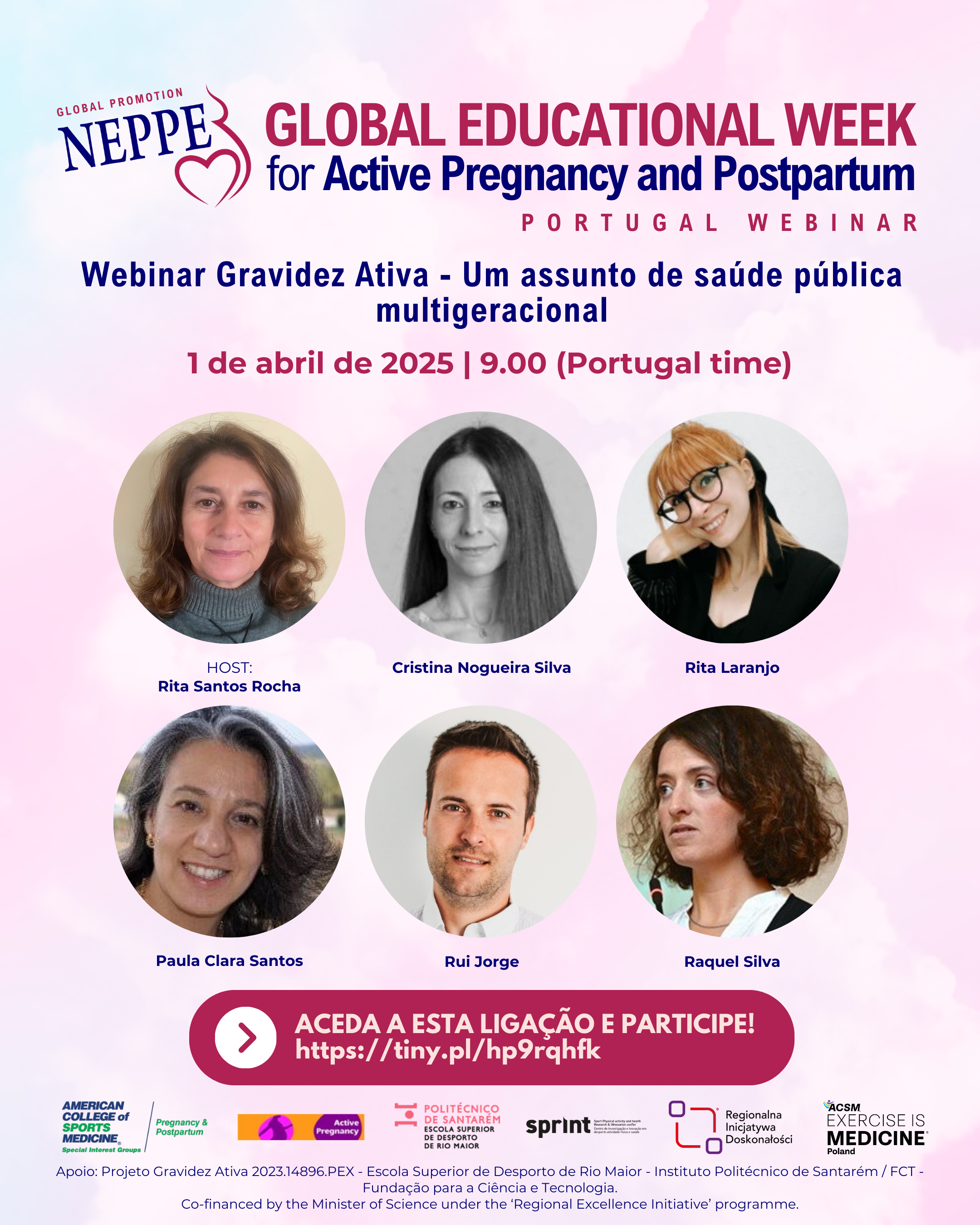 Neste webinar aberto à comunidade, vários especialistas na área da saúde e do exercício físico vão apresentar as mais recentes recomendações e estratégias para a promoção da atividade física, da condição física, da alimentação, do sono e da saúde em geral durante o período da gravidez e do pós-parto.