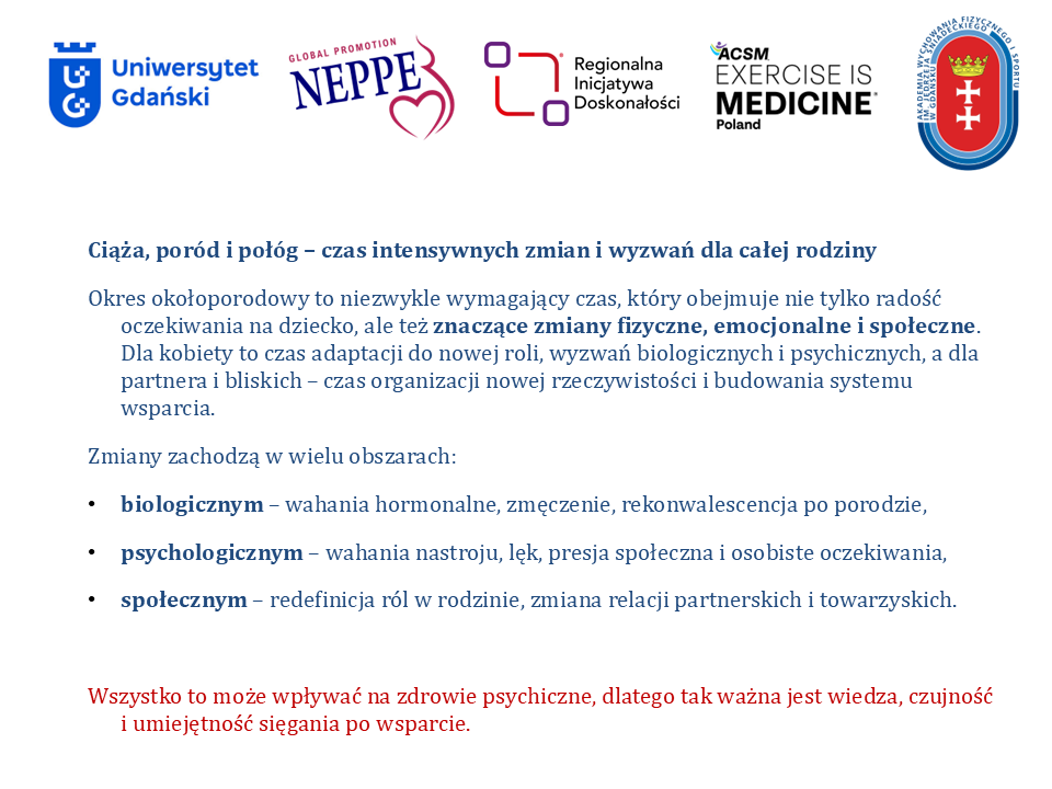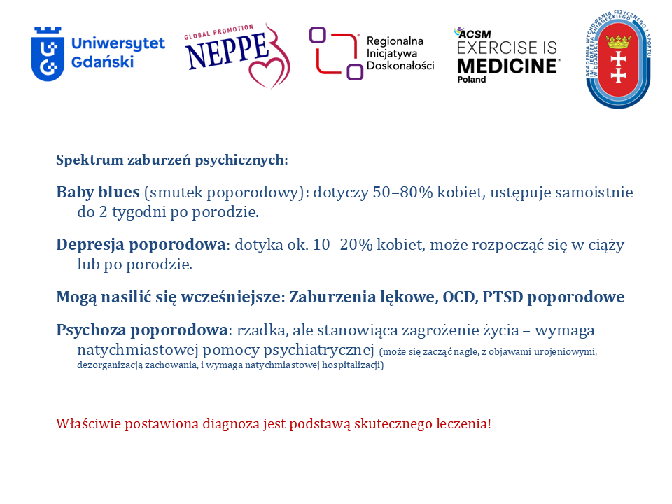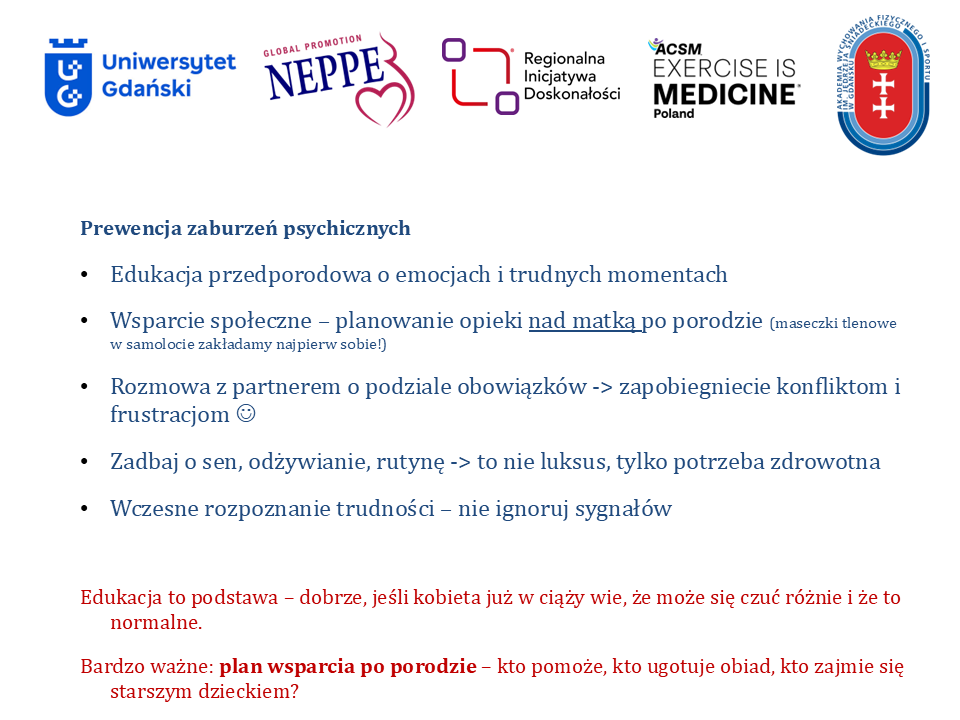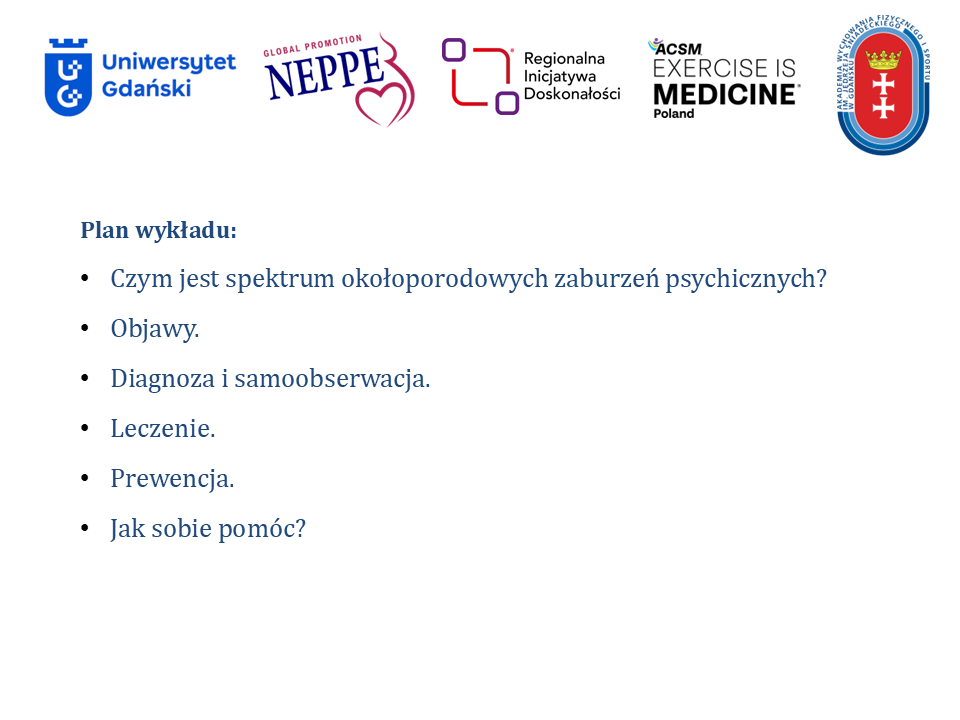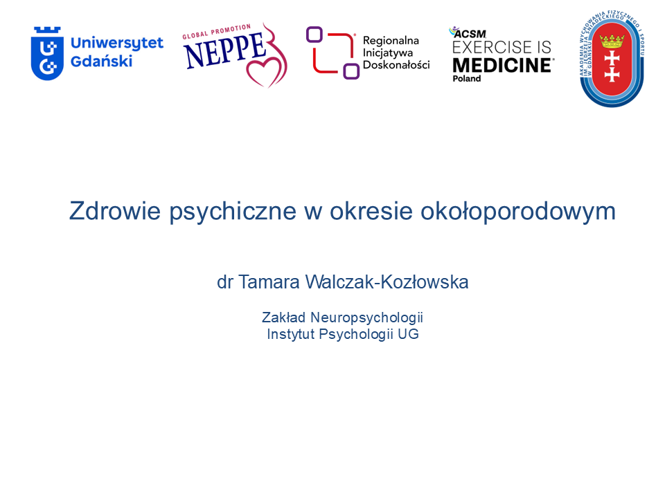 - 13.45-14.15 Wykład na temat zdrowia psychicznego w okresie okołoporodowym – dr Tamara Walczak-Kozłowska (Uniwersytet Gdański)