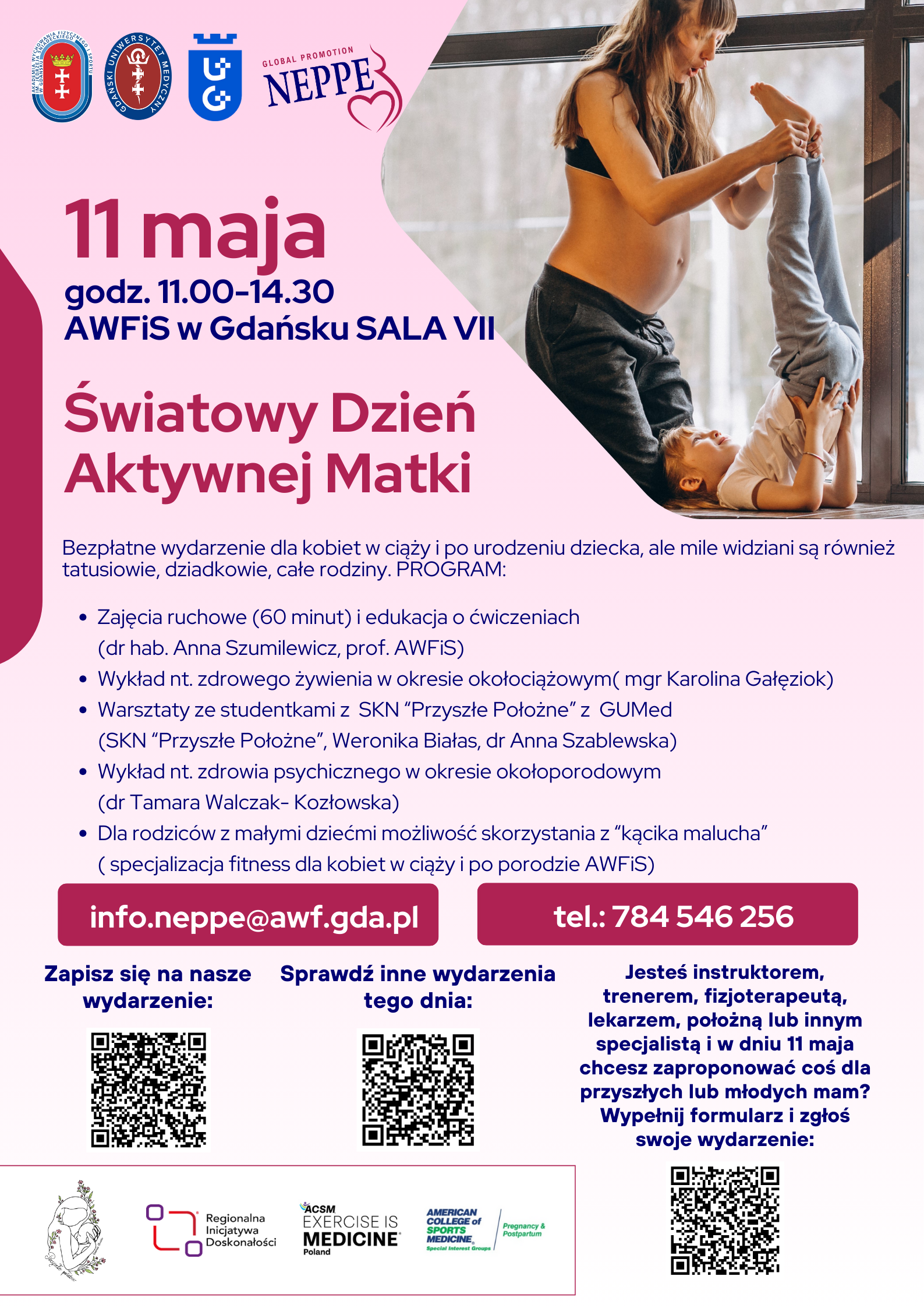 11 maja 2025 roku w Akademii Wychowania Fizycznego i Sportu w Gdańsku odbyło się wydarzenie w ramach Światowego Dnia Aktywnej Matki ( Global Active Mother’s Day). Tego dnia na młode mamy, kobiety w ciąży i całe rodziny czekały zajęcia ruchowe oraz szereg wykładów dotyczących szeroko pojętego zdrowia w okresie reprodukcyjnym.