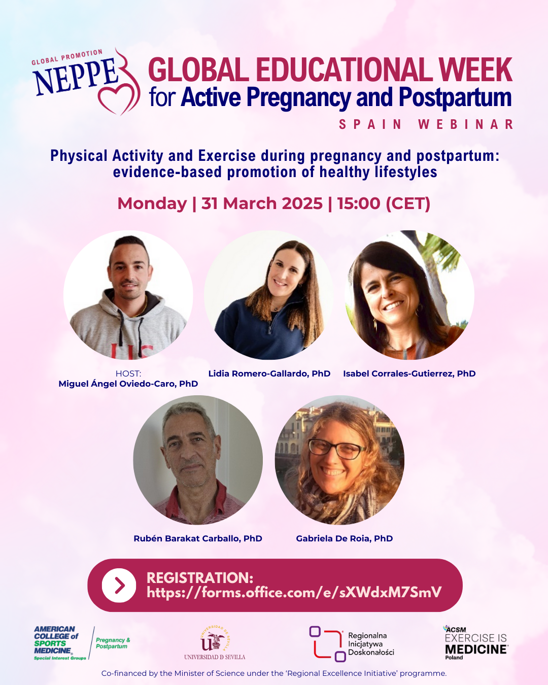 The webinar will present the results of multidisciplinary research explaining the impact of physical activity and exercise programmes on the health of mothers and children. Based on high impact projects such as ‘Barakat model’ from the Polytechnic University of Madrid, ‘GestaFit project’ from the University of Almería and the University of Granada, ‘The PregnActive project’ from the University of Seville and the University Pablo de Olavide, the webinar will show how scientific knowledge can shape practical guidelines for developing of supervised and non-supervised exercise programas, promoting healthy lifestyle changes, and developing a comprehensive treatment from the primary and specific health care settings.